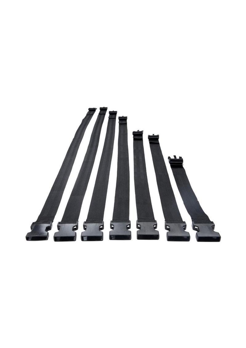 Restrain your partner with seven body straps in varying lengths. Each one adjusts to tighten around your lovers prone body, allowing you to customize their captivity. The easy-to-use buckles create a convenient bondage as your plaything is wrapped from shoulders to ankles, effectively immobilizing them so that they are entirely at your mercy!