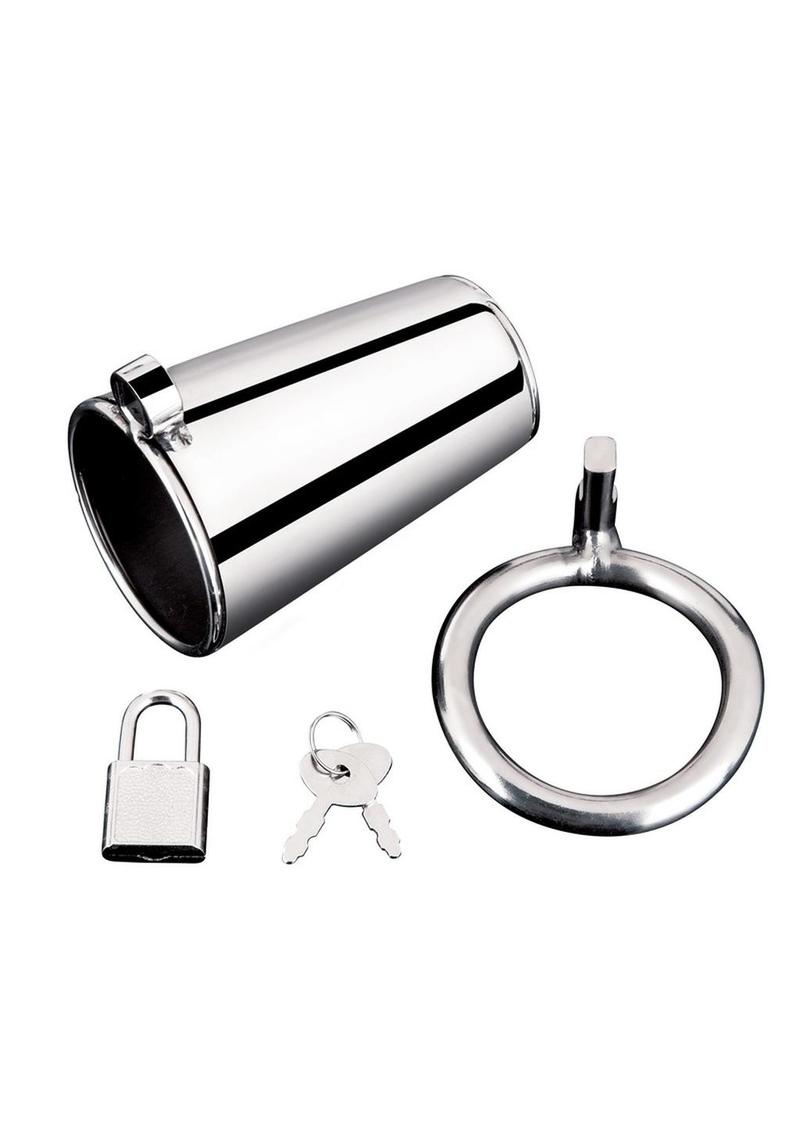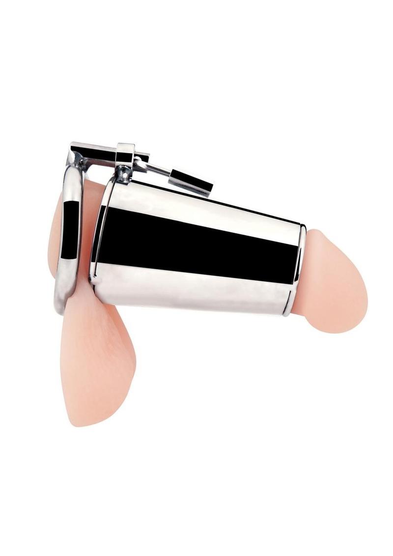 The Ultimate Cock Tease Cage is a cylinder-shaped chastity device that provides a nearly solid enclosure to the shaft, exposing just the tip. When the Ultimate Cock Tease Cage is worn, the wearer can experience the way that denying sensation heightens arousal to explosive new levels. With a separate ring to wear around the testicles, this chastity device offers a kinky sensation boost. Lock the device in place using the included padlock to keep him securely entrapped.